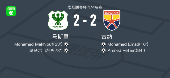 北京时间3月30日埃及联赛杯 1/4决赛,马斯里对阵古纳。马斯里Mohamed Makhlouf破门,奥马尔-萨伊破门。古纳Mohamed Emad破门,Ahmed Refaat破门。最终比分马斯里 2-2 古纳。