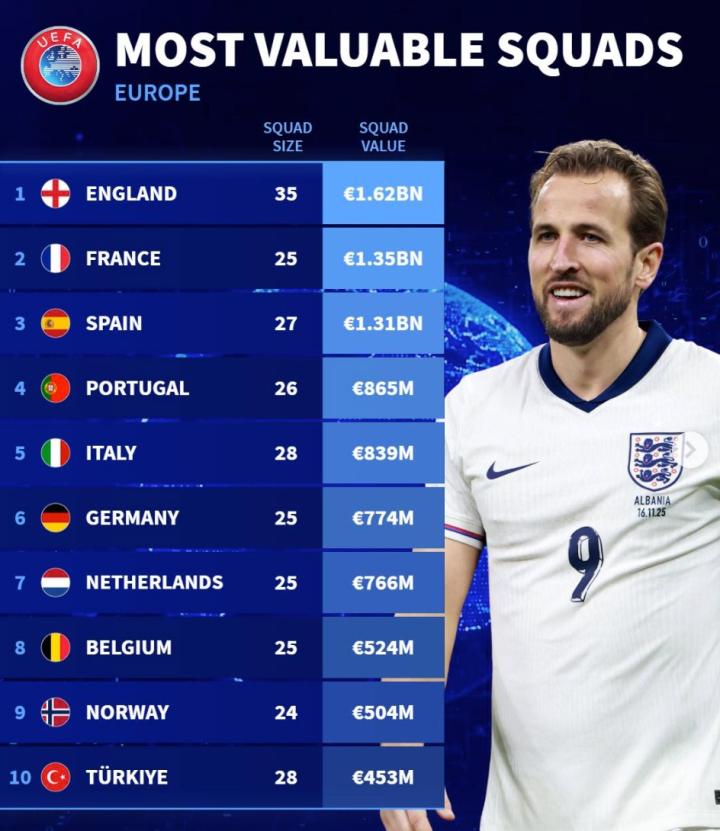 3月国际比赛欧洲国家队身价前10:英格兰超16亿第1,挪威上榜