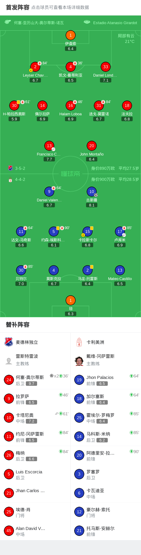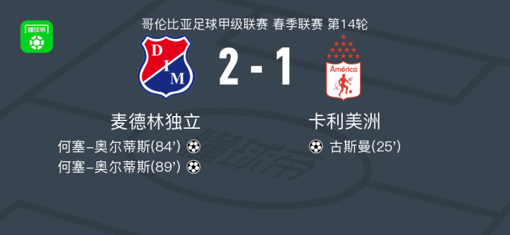 北京时间3月31日哥伦比亚足球甲级联赛 春季联赛 第14轮,麦德林独立主场对阵卡利美洲。麦德林独立何塞-奥尔蒂斯梅开二度。卡利美洲古斯曼破门。最终比分麦德林独立 2-1 卡利美洲。