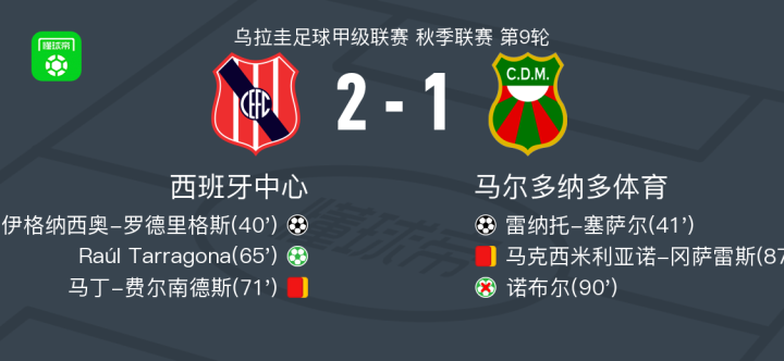 北京时间3月31日乌拉圭足球甲级联赛 秋季联赛 第9轮,西班牙中心主场对阵马尔多纳多体育。西班牙中心伊格纳西奥-罗德里格斯破门,Raúl Tarragona破门。马尔多纳多体育雷纳托-塞萨尔破门。最终比分西班牙中心 2-1 马尔多纳多体育。