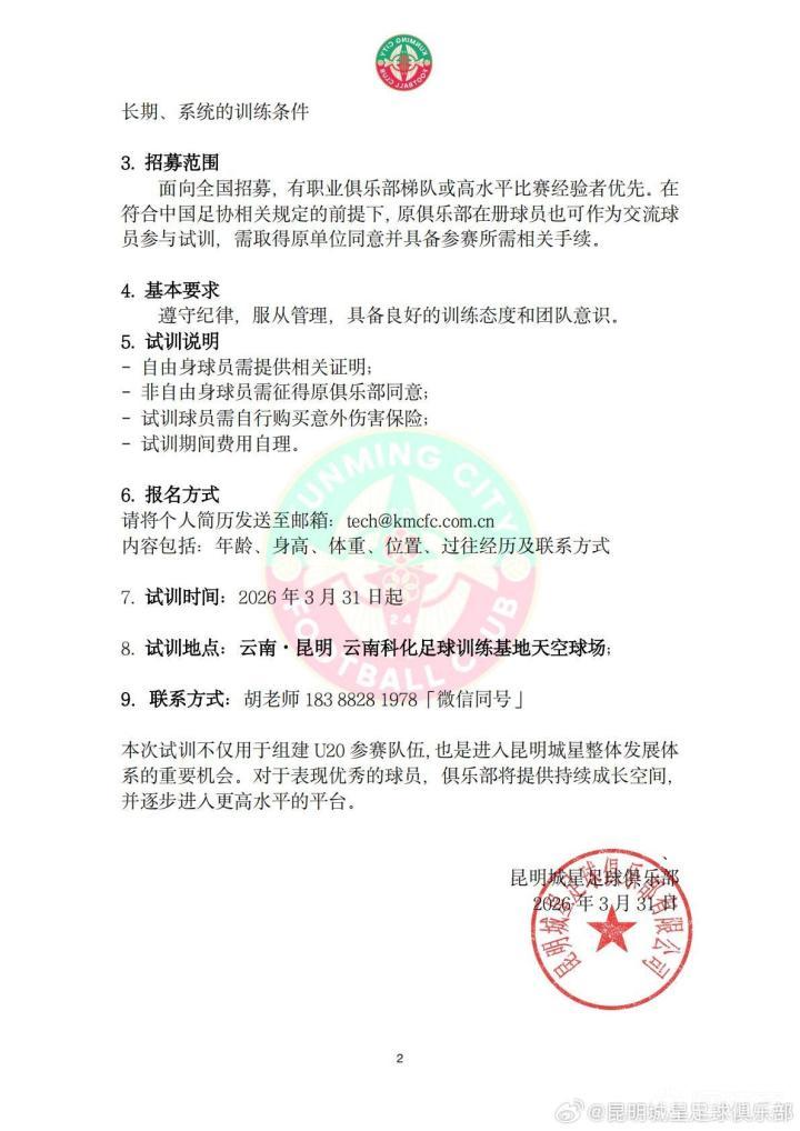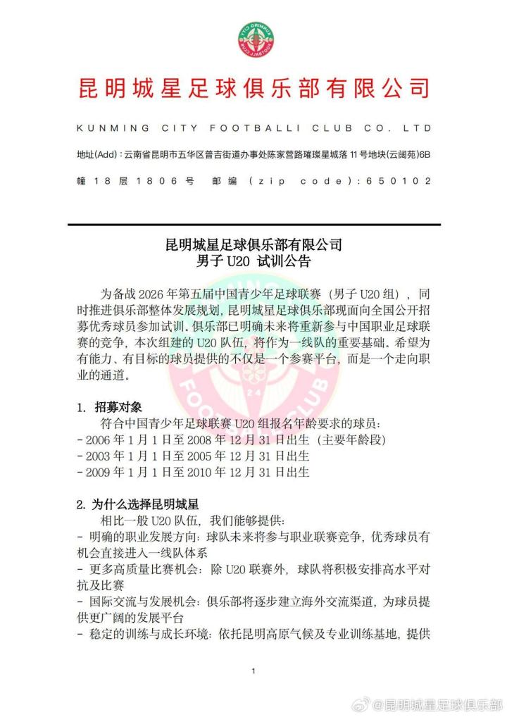 为备战2026年第五届中国青少年足球联赛(男子U20组),同时推进俱乐部整体发展规划,昆明城星足球俱乐部现面向全国公开招募优秀球员参加试训。俱乐部已明确未来将重新参与中国职业足球联赛的竞争,本次组建的U20队伍,将作为一线队的重要基础。希望为有能力、有目标的球员提供的不仅是一个参赛平台,而是一个走向职业的通道。