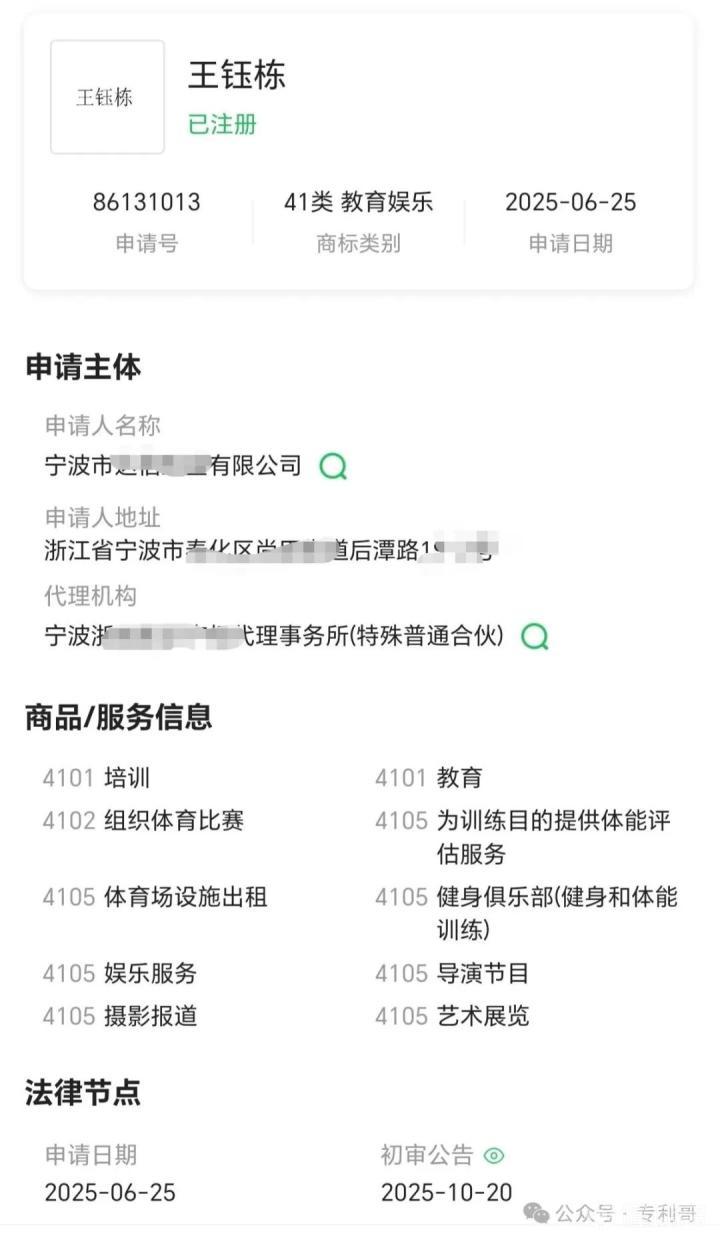 博主:王钰栋的名字已成功注册了50多个品类的商标