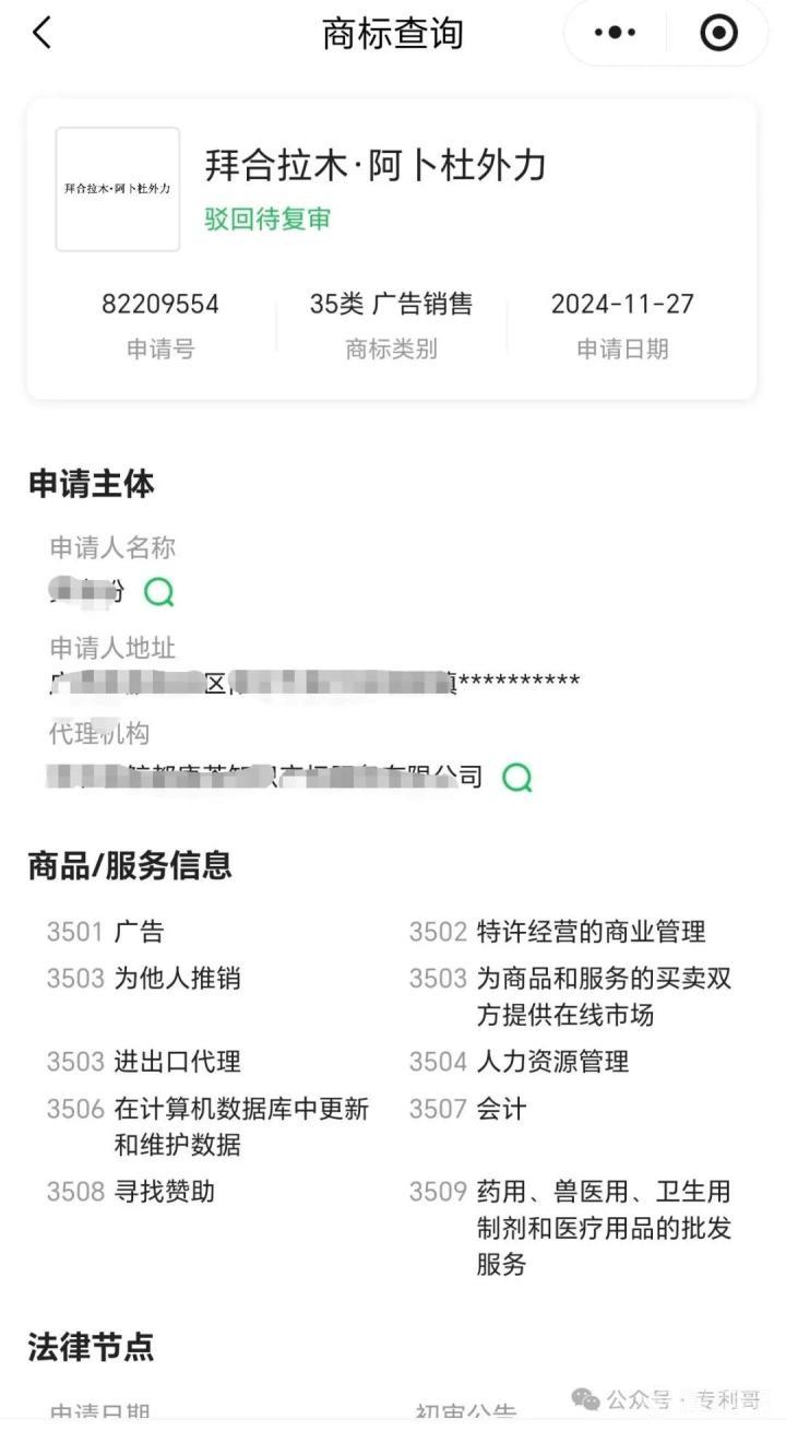 此外,博主还查询了拜合拉木的情况,他指出拜合拉木应该没有保护个人姓名商标,经查询,有一个申请但被驳回了,应是审查员根据商标法相关规定驳回的(不允许注册名人姓名作商标,除非名人本人授权)。