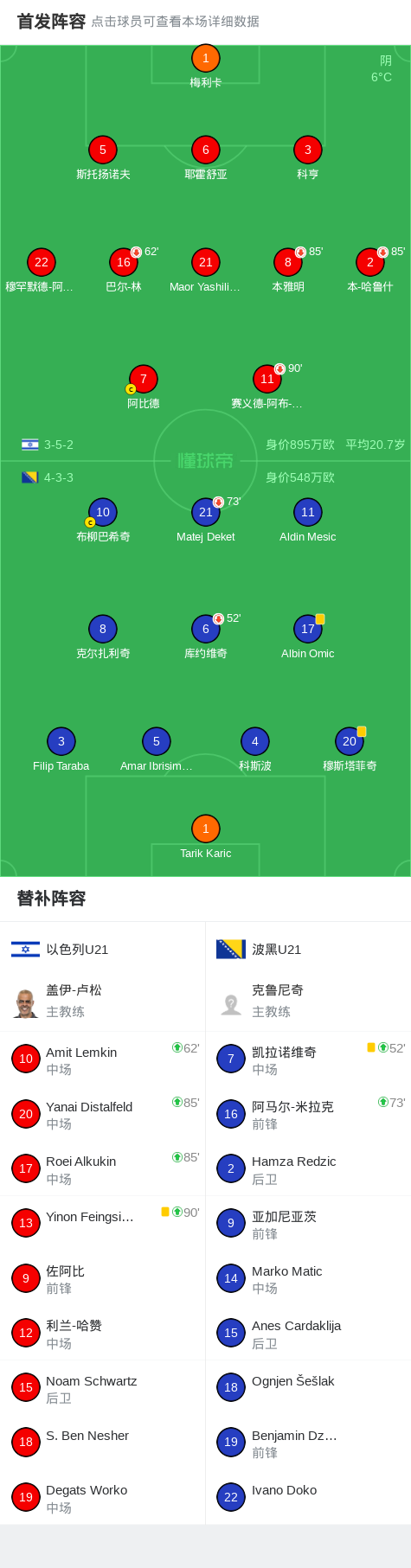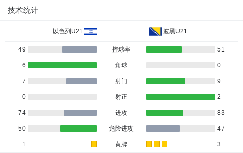 以色列U21 0-0波黑U21,双方握手言和战报bot @懂球帝04-01 00:56北京时间3月31日欧洲U21青年锦标赛资格赛 小组赛,以色列U21对阵波黑U21。最终比分以色列U21 0-0 波黑U21。点击查看本场比赛详细数据>>精彩瞬间下半场补时第1分钟,波黑U21球队B. Krunić吃到红牌。 球队阵容 技术统计 展开更多