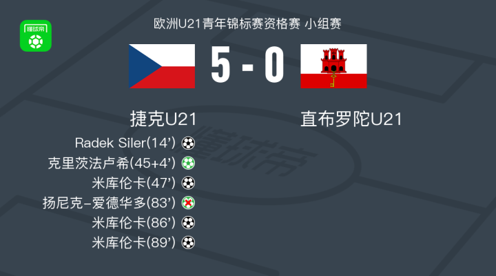 捷克U21 5-0狂胜直布罗陀U21,米库伦卡帽子戏法,克里茨法卢希点射
