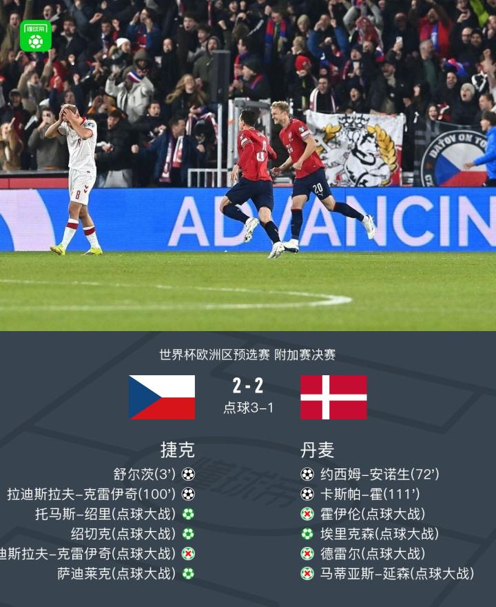 北京时间4月1日世界杯欧洲区预选赛 附加赛决赛,捷克对阵丹麦。上半场舒尔茨闪击,下半场安诺生破门扳平。加时大赛克雷伊奇破门将比分超出,霍扳平比分,双方120分钟战平进入点球大战。点球大战霍伊伦、德雷尔、延森失点,最终捷克总比分5:3丹麦晋级世界杯。