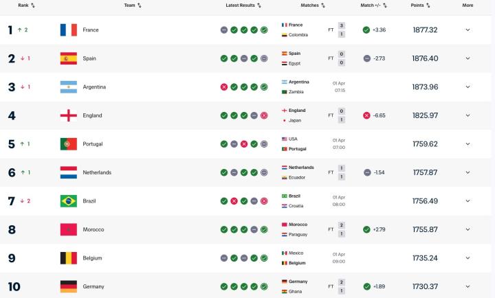随着西班牙在友谊赛0-0战平埃及,法国在FIFA的实时排名上升至首位,西班牙降至第二位。