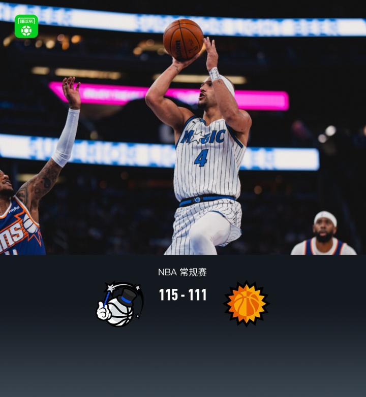 第四节魔术萨格斯拿下7分,太阳德文-布克拿下5分,最终魔术115-111战胜太阳