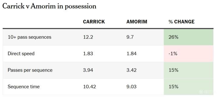 本赛季初,阿莫林明确推行更快、更直接的踢法,而在卡里克执教后,这一节奏几乎没有下降——从每秒1.84米降至每秒1.83米。
