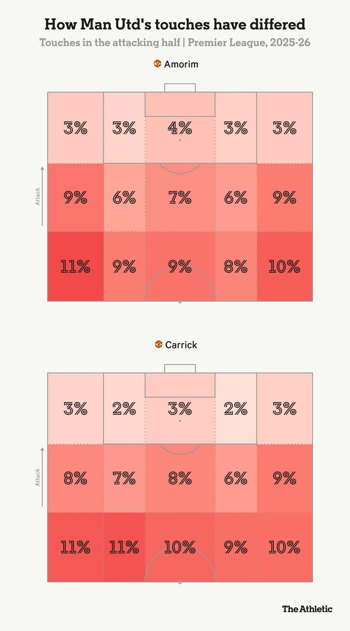 这一变化在数据中体现得较为细微,但下方进攻半场的触球热图显示,卡里克麾下的球队比阿莫林时期更频繁地在肋部区域活动。