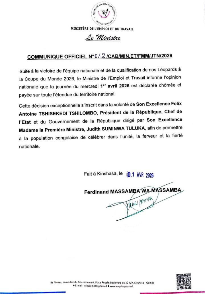该公告表示,随着民主刚果队在预选赛中完成英雄般的晋级,全民族沉浸在喜悦之中。民主刚果就业与劳动部正式宣布,2026年4月1日为全国带薪假日,全境放假,以示庆祝。