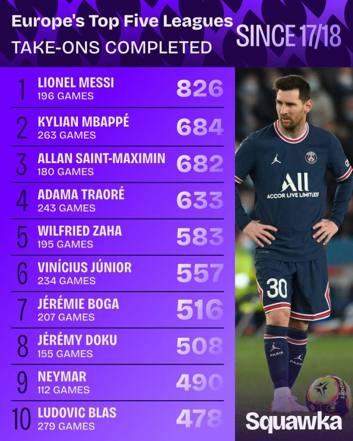 北京时间4月1日,知名数据平台Squawka列2017-18赛季以来欧洲五大联赛成功过人榜,梅西196场826次位居首位,姆巴佩263场684次位居次席。