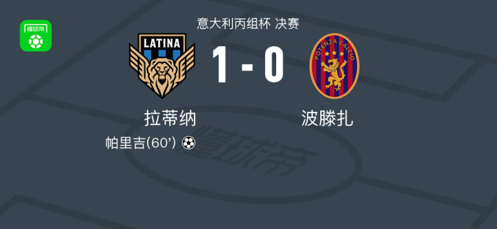 拉蒂纳1-0波滕扎,帕里吉制胜球战报bot @懂球帝04-02 04:26北京时间4月2日意大利丙组杯 决赛,拉蒂纳对阵波滕扎。拉蒂纳帕里吉破门。最终比分拉蒂纳 1-0 波滕扎。点击查看本场比赛详细数据>>精彩瞬间第60分钟,拉蒂纳球员帕里吉打入一球。 球队阵容 技术统计 展开更多