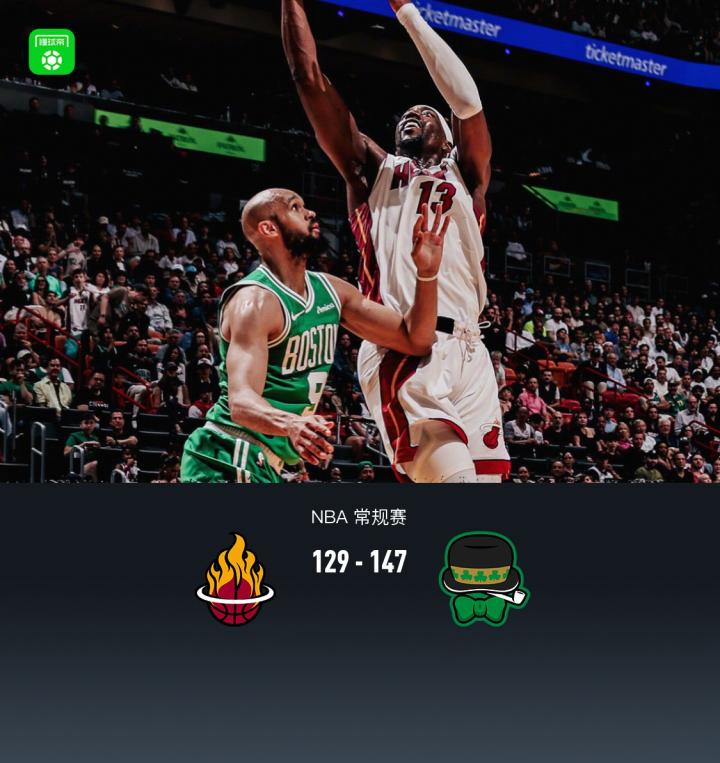 第四节热火阿德巴约拿下8分,凯尔特人奎塔拿下11分,最终热火129-147不敌凯尔特人