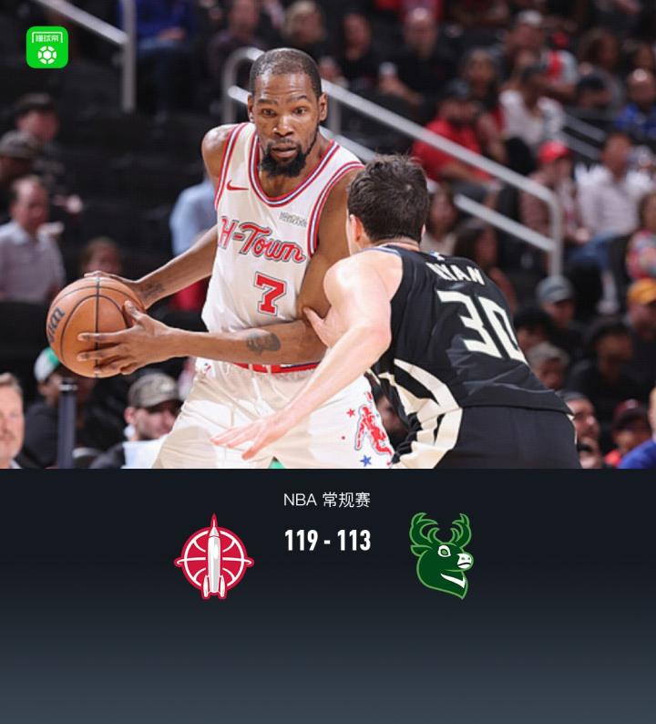 火箭119-113力克雄鹿,谢泼德9记三分,杜兰特18+9