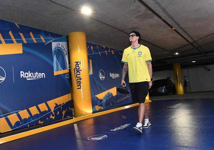 NBA常规赛金州勇士vs圣安东尼奥马刺的比赛正在进行中,赛前勇士后卫吉-桑托斯身穿巴西足球国家队世界杯球衣出现在了球场,引起了人们的注意。