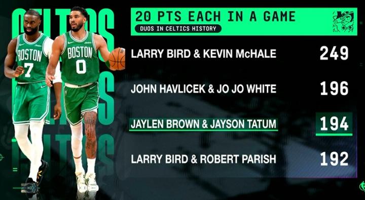 布朗和塔图姆第194次单场得分均20+,凯尔特人队史双人组第三