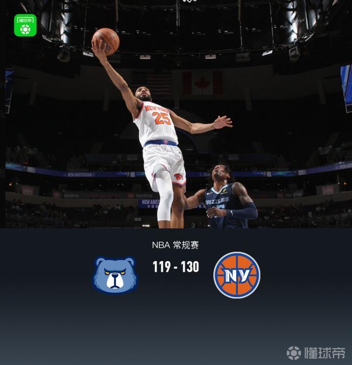 尼克斯130-119灰熊止3连败,阿奴诺比25+13,唐斯大三双