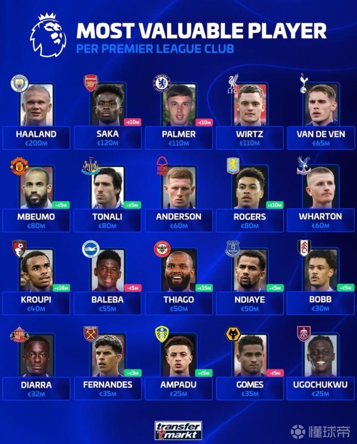 德转列英超20队身价最高球员:哈兰德2亿第1,两人2500万最低