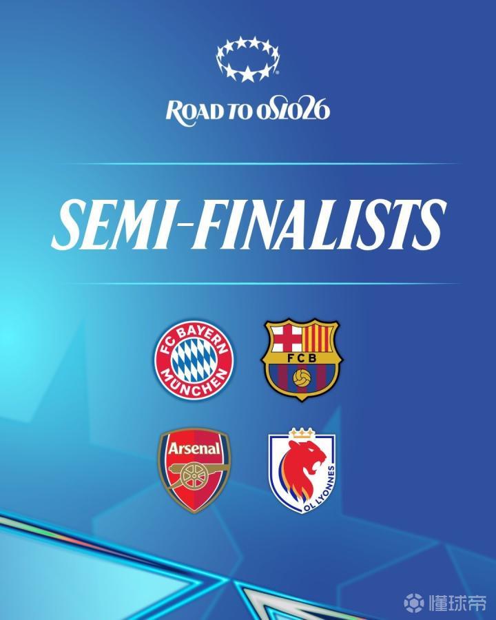 女足欧冠半决赛对阵:巴萨vs拜仁,里昂vs阿森纳