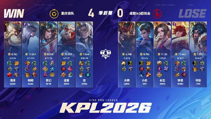 2026KPL胜者组决赛:重庆狼队4-0成都AG超玩会率先晋级决赛