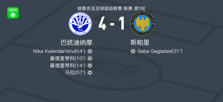 巴统迪纳摩4-1大胜斯帕里,曼德里琴科两球,马拉1射1传