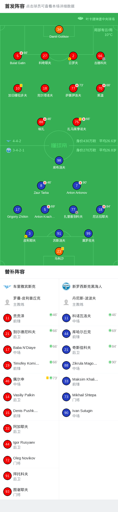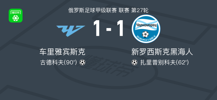 北京时间4月3日俄罗斯足球甲级联赛 联赛 第27轮,车里雅宾斯克主场对阵新罗西斯克黑海人。车里雅宾斯克古德科夫破门。新罗西斯克黑海人扎里普别科夫破门。最终比分车里雅宾斯克 1-1 新罗西斯克黑海人。