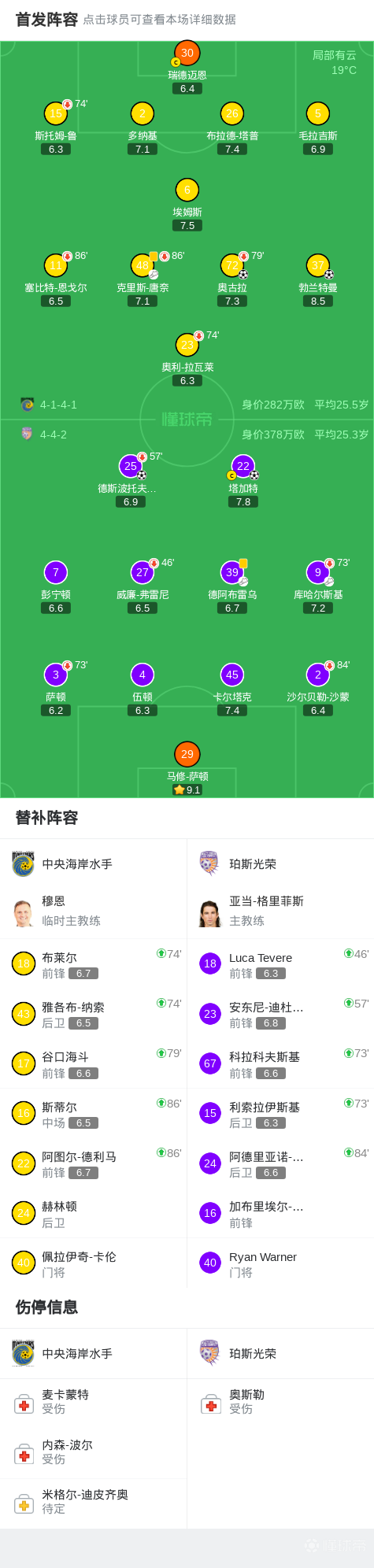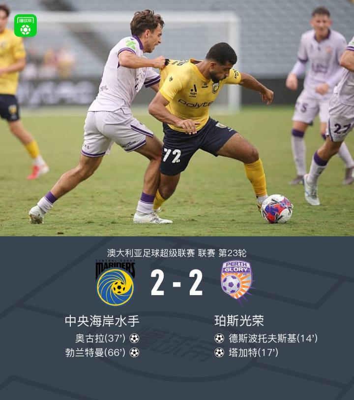 第37分钟,奥古拉任意球直接破门扳回一分,中央海岸水手1-2珀斯光荣