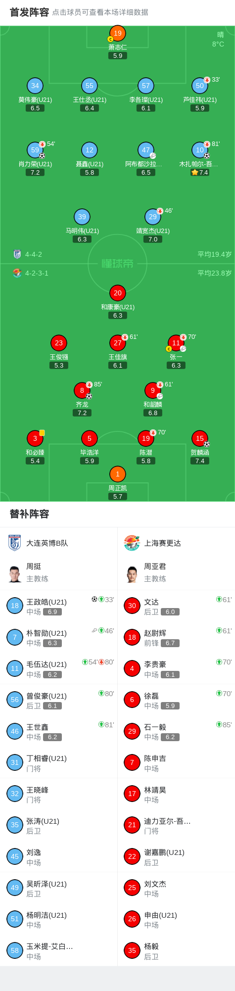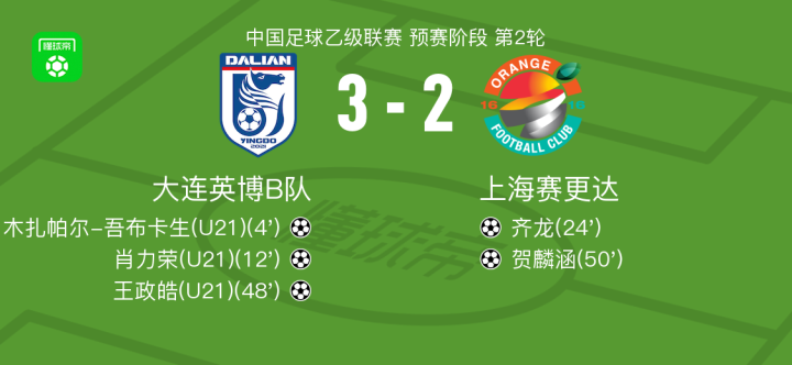 北京时间4月4日中国足球乙级联赛 预赛阶段 第2轮,大连英博B队主场对阵上海赛更达。大连英博B队木扎帕尔-吾布卡生破门,肖力荣破门,王政皓破门。上海赛更达齐龙破门,贺麟涵破门。最终比分大连英博B队 3-2 上海赛更达。