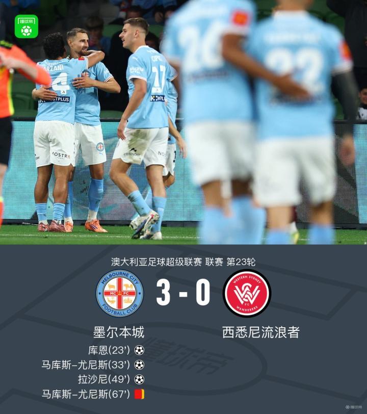 十人墨尔本城3-0西悉尼流浪者,尤尼斯传射+染红,库恩破门