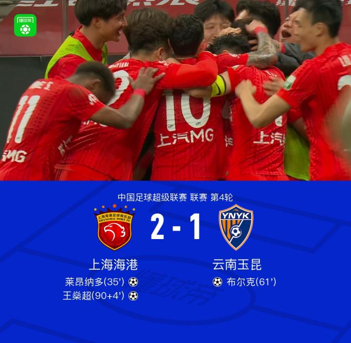 北京时间4月4日19:35,中超第4轮焦点战,上海海港坐镇上汽浦东足球场迎战云南玉昆,本场主裁判为黄翼,VAR裁判为张雷。上半场,吾米提江开场门线救险,加布里埃尔助攻莱昂纳多破门,海港两粒进球被判无效。下半场,布尔克头槌扳平比分,王燊超替补登场献绝杀。最终,海港2-1击败云南。