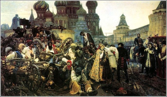 (图)油画《禁卫军行刑的早晨》,表现彼得大帝镇压索菲亚叛支持者的历史事件