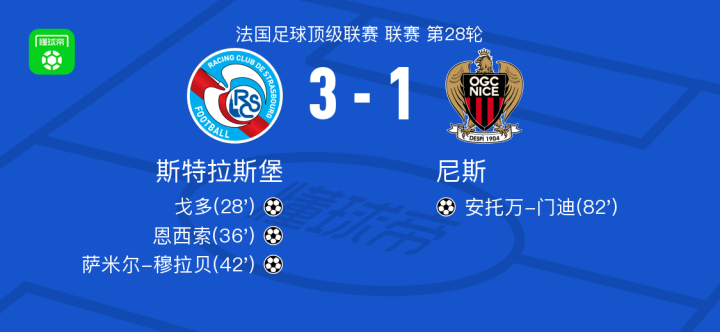 北京时间4月4日法国足球顶级联赛第28轮,斯特拉斯堡主场迎战尼斯。比赛中,斯特拉斯堡球员戈多、恩西索、萨米尔-穆拉贝先后建功,尼斯球员安托万-门迪打入一球。最终斯特拉斯堡以3-1的比分战胜尼斯。