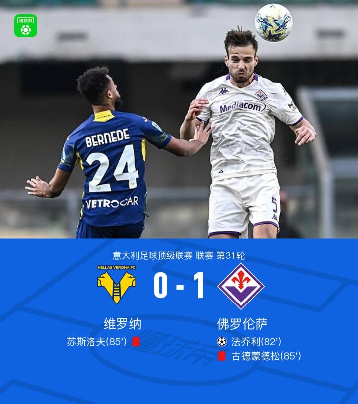 维罗纳0-1佛罗伦萨,法乔利制胜,苏斯洛夫、古德蒙德松染红