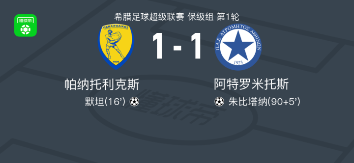 北京时间4月5日希腊足球超级联赛 保级组 第1轮,帕纳托利克斯主场对阵阿特罗米托斯。帕纳托利克斯默坦破门。阿特罗米托斯朱比塔纳破门。最终比分帕纳托利克斯 1-1 阿特罗米托斯。