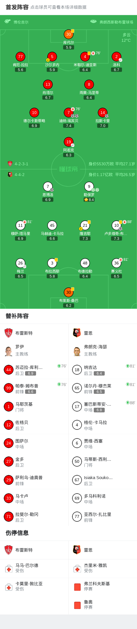 雷恩4-3逆转布雷斯特,勒保罗两球,恩博洛建功