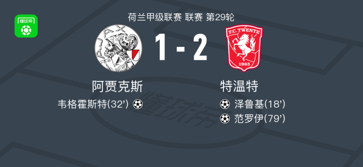 北京时间4月5日荷兰甲级联赛 联赛 第29轮,阿贾克斯主场对阵特温特。阿贾克斯韦格霍斯特破门。特温特泽鲁基破门,范罗伊破门。最终比分阿贾克斯 1-2 特温特。