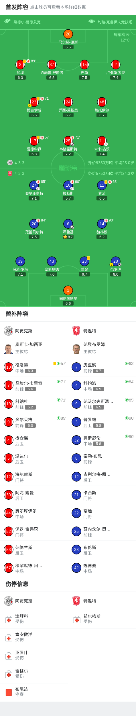 特温特2-1阿贾克斯,范罗伊、泽鲁基破门