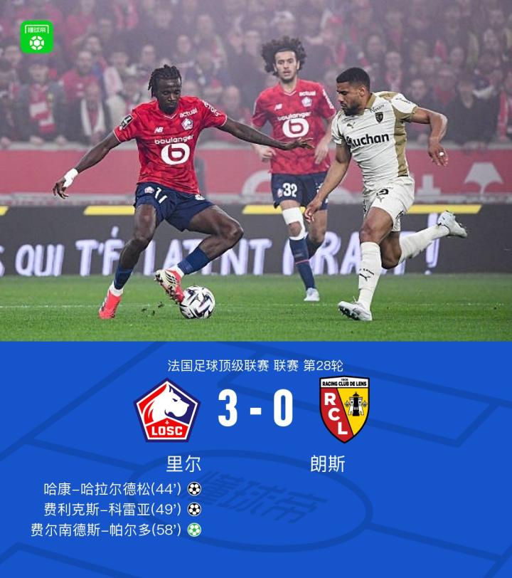 北京时间4月5日,法国足球甲级联赛第28轮,里尔主场对阵朗斯。比赛中,帕尔多传射,哈拉尔德松、费利克斯-科雷亚分别破门。最终,里尔3-0战胜朗斯。