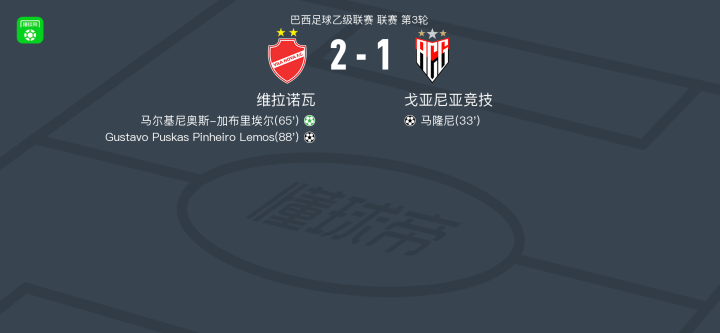 北京时间4月5日巴西足球乙级联赛 联赛 第3轮,维拉诺瓦主场对阵戈亚尼亚竞技。维拉诺瓦马尔基尼奥斯-加布里埃尔破门,Gustavo Puskas Pinheiro Lemos破门。戈亚尼亚竞技马隆尼破门。最终比分维拉诺瓦 2-1 戈亚尼亚竞技。