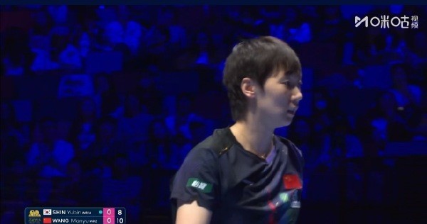 第三局,申裕斌继续针对王曼昱的中间位开局连得3分以3-0领先。王曼昱以一记精彩回球追至2-3。随后王曼昱追至5-5后,申裕斌仍坚持打中路保持领先,并以10-8拿到局点。
