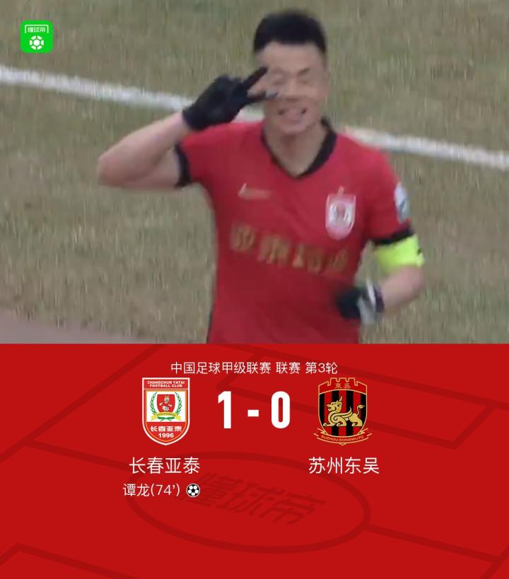 北京时间4月5日中国足球甲级联赛第3轮,长春亚泰主场对阵苏州东吴。谭龙破门,卡米洛进球被吹+中框。最终比分长春亚泰1-0苏州东吴。
