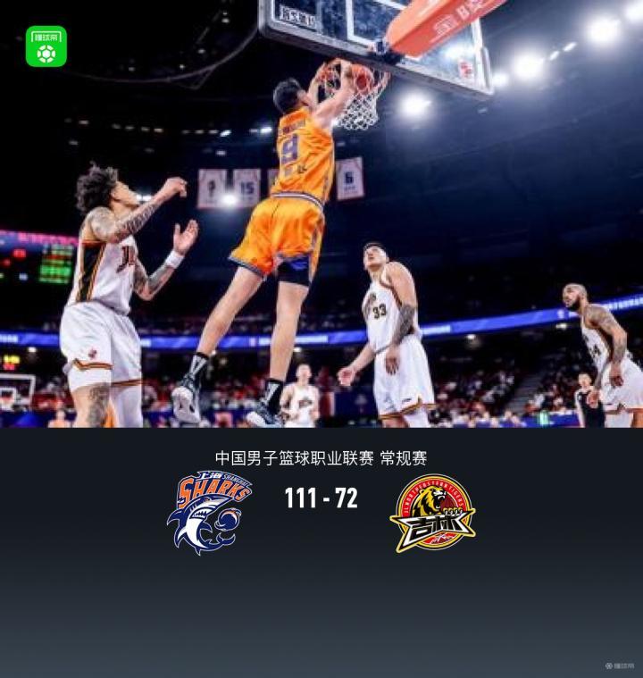 第四节上海闫鹏飞拿下15分,吉林段立谦拿下10分,最终上海111-72战胜吉林