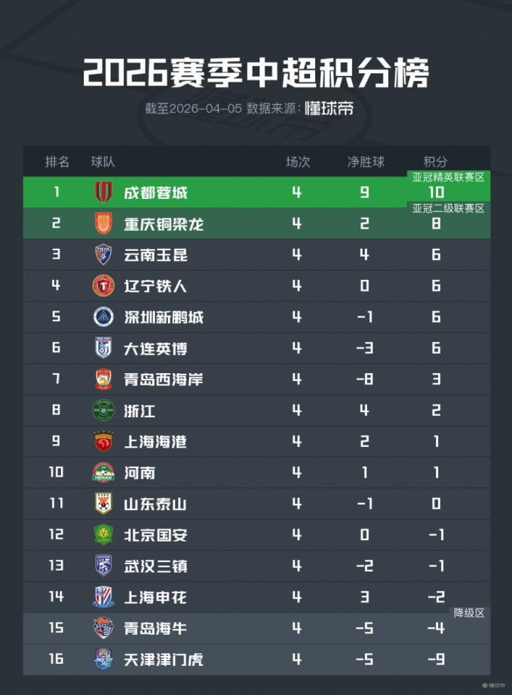 中超第4轮,成都蓉城5-1大胜青岛西海岸,目前积10分继续领跑中超积分榜。重庆铜梁龙1-0战胜浙江,反超云南玉昆来到第2,云南玉昆本轮虽输球,但仍凭借净胜球优势排在第3。此外,上海海港本轮取胜,成功将积分转正。