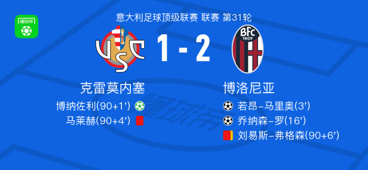 北京时间4月5日意大利足球甲级联赛第31轮,克雷莫内塞主场迎战博洛尼亚。比赛中,博洛尼亚率先取得进球,随后再下一城;下半场补时阶段,克雷莫内塞通过点球扳回一球,此后双方各有一名球员吃到红牌相关纪律处罚。最终,克雷莫内塞1-2不敌博洛尼亚。