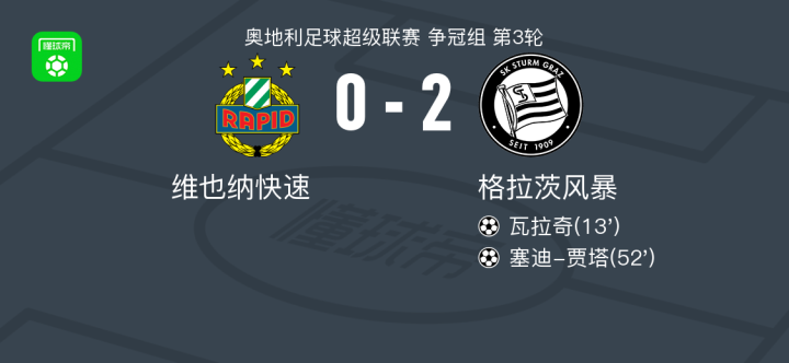 格拉茨风暴2-0维也纳快速,瓦拉奇破门,塞迪-贾塔锦上添花