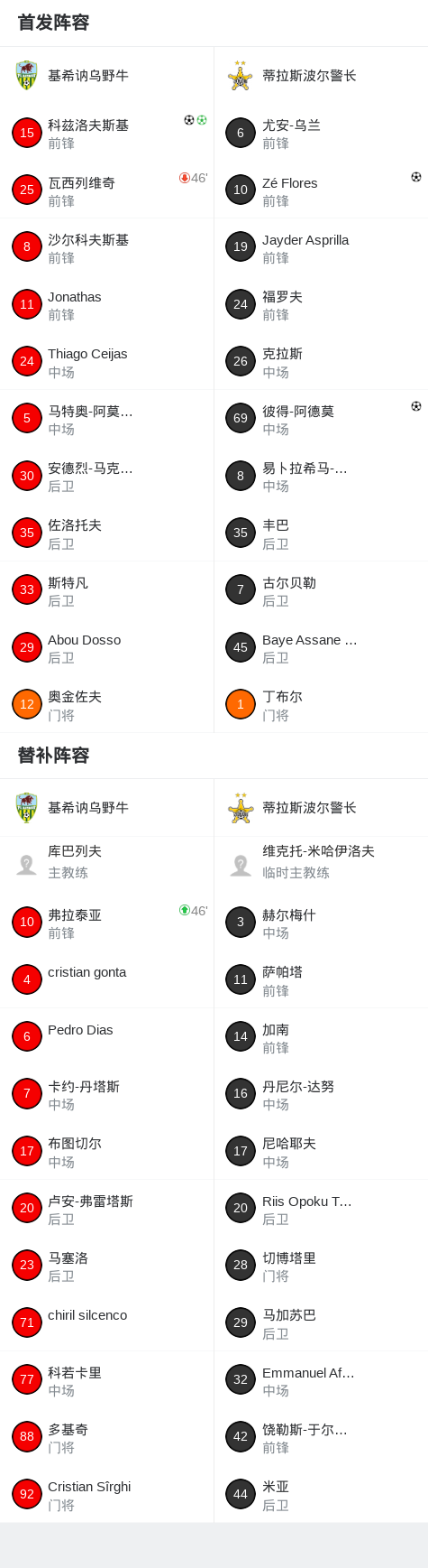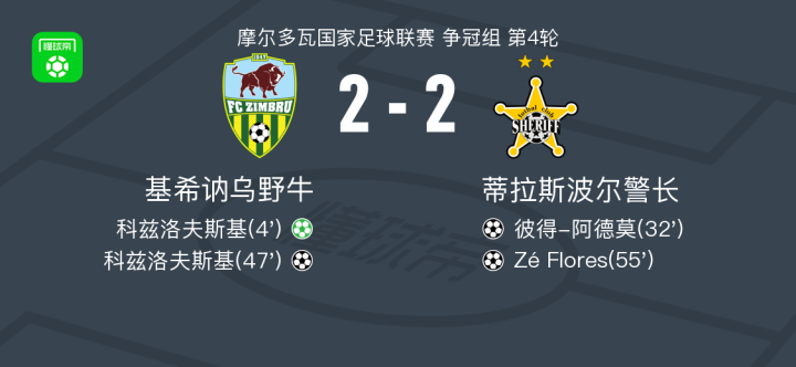 基希讷乌野牛2-2蒂拉斯波尔警长,科兹洛夫斯基破僵,Zé Flores扳平比分