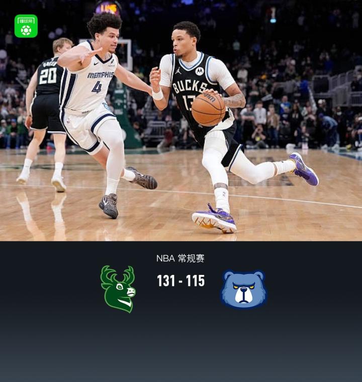 第四节雄鹿普林斯拿下10分,灰熊小克莱顿拿下6分,最终雄鹿131-115战胜灰熊