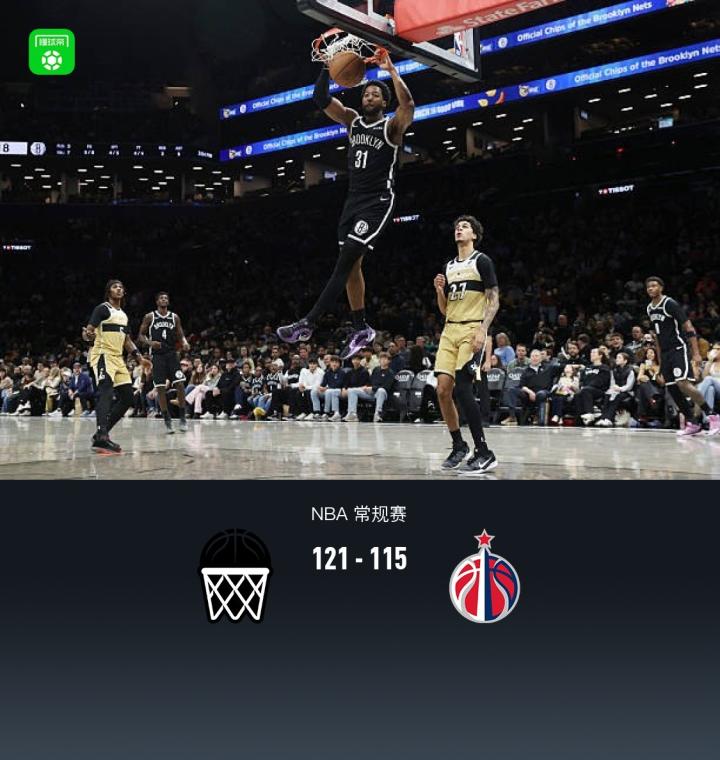 第四节篮网诺兰-特拉奥雷拿下10分,奇才威尔-莱利拿下12分,最终篮网121-115战胜奇才