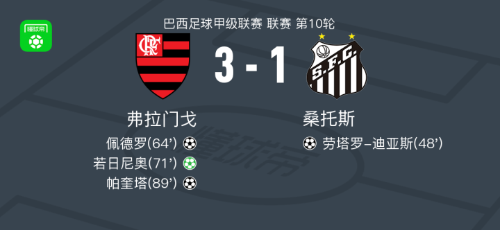 北京时间4月6日巴西足球甲级联赛 联赛 第10轮,弗拉门戈主场对阵桑托斯。弗拉门戈佩德罗破门,帕奎塔破门,若日尼奥破门。桑托斯劳塔罗-迪亚斯破门。最终比分弗拉门戈 3-1 桑托斯。